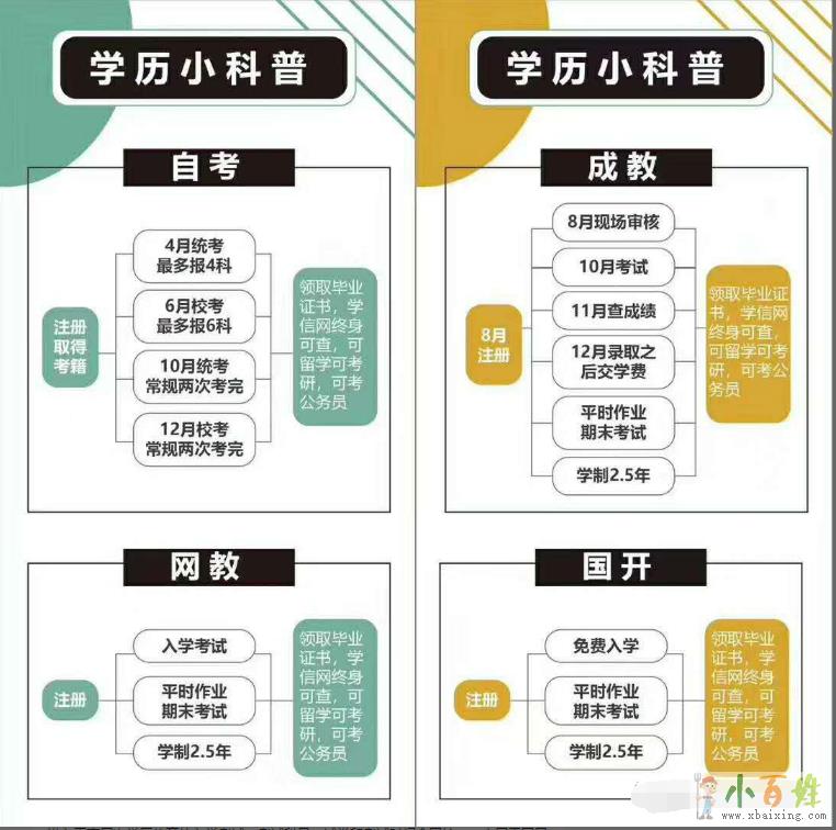 2、自学考试(自考):没有入学考试,考生参加单科考试,合格一门,发一门的合格证书,所有科目合格后,颁发学历证书。每年一般有两次考试,两次招生,考生根据自身情况选择考试科目。主要设(专升本)科层次小百姓网。